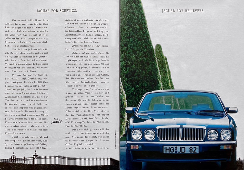 1991, „Jaguar for Sceptics. Jaguar for Believers.“ XJ40 advertising