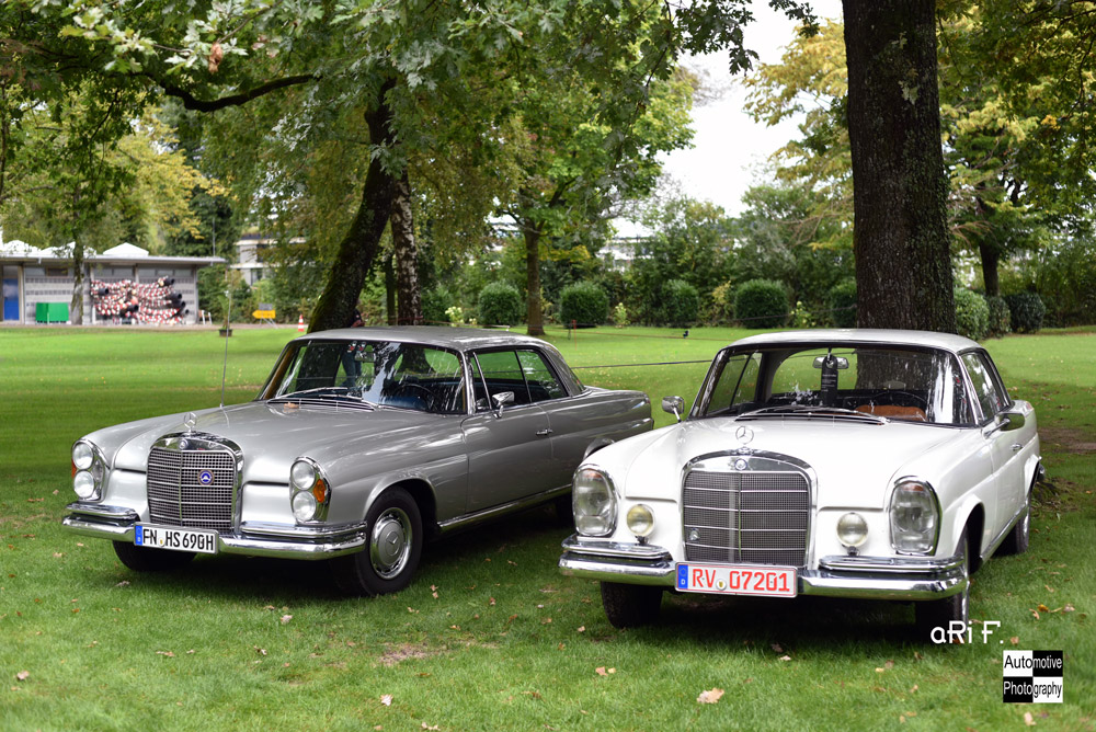28. Oktober 2025 1000 × 668 Zwei Mercedes-Benz W 111 Coupés links mit US-Doppelscheinwerfer, rechts Serie mit Einglasscheinwerfer